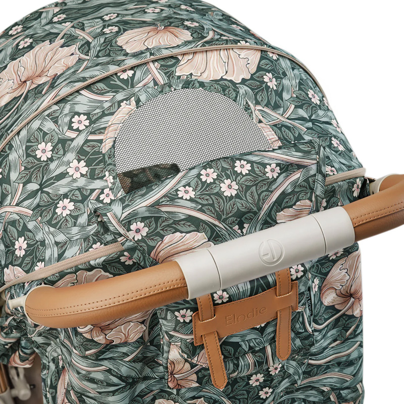 ジッパーを開けると大きく開く、折りたたみ式キャノピーは、UPF50+の紫外線カット機能付き、突然の雨にも対応する撥水仕様。