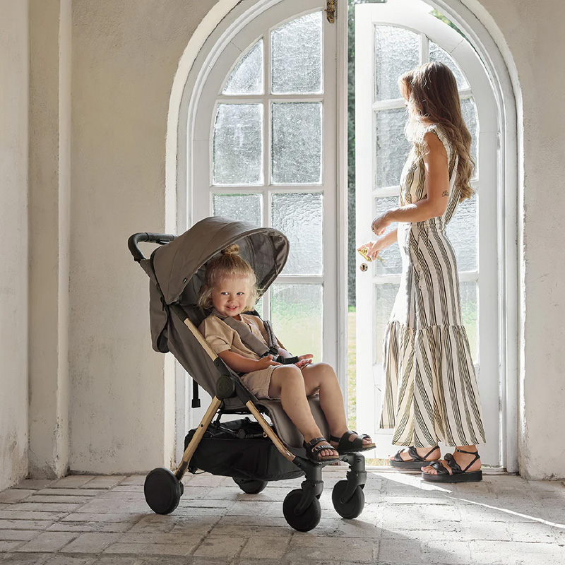 最もリクライニングした状態で新生児から使用可能。UPF50+のキャノピーが紫外線や風を防ぎ、軽量なのに頑丈なフレームと衝撃吸収ホイールで、スムーズで快適な乗り心地。別売りアダプターを使用すればカーシートとも連携可能。